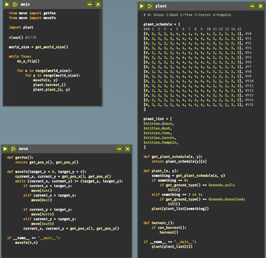 저는 일단 요런 느낌으로 땅의 레이아웃을 다 일일이 노가다로 어떤 작물을 심을지 지정해서 진행하도록 꾸며봤는데
