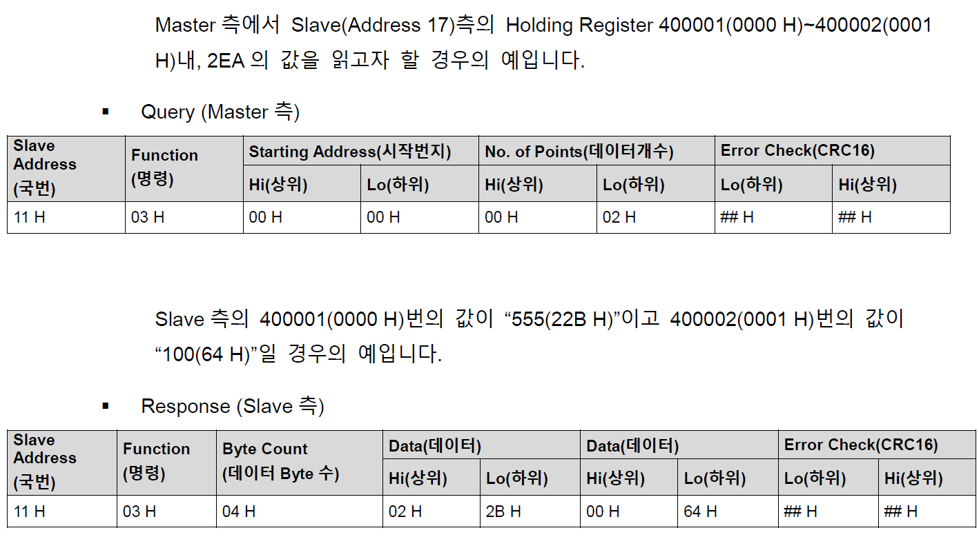 (HEX 예시) 0x01 03 0000 000A C5CD