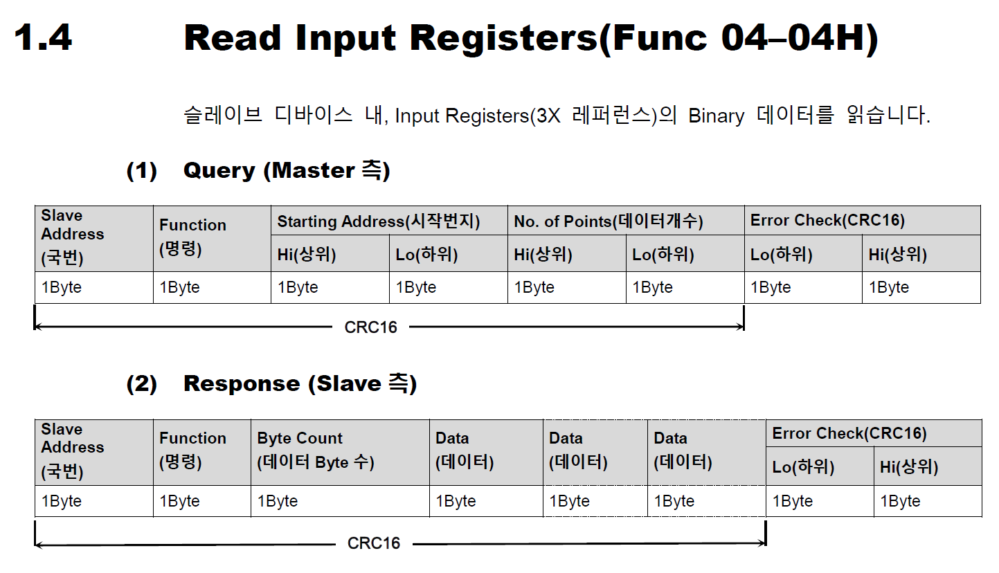 흔히 사용하는 데이터를 읽는 펑션 (04) 를 보더라도 [국번][펑션코드][시작번지][데이터갯수][CRC-16] 메시지 형식을 취하고 있는것을 알수있습니다.