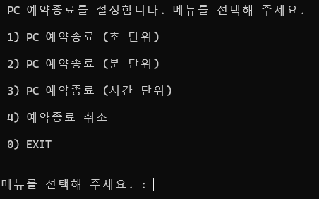 메뉴 형태로 선택해서 예약 종료를 설정할 수 있는 배치파일(.bat)을 만들어 보았습니다.