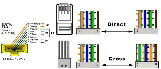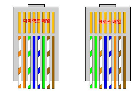 다이렉트 배열의 랜케이블은 PC나 콘트롤러와 공유기 HUB를 통해 통신을 할 경우 사용되며 크로스 배열의 랜케이블은 PC-PC, PC-콘트롤러 등과 같이 공유기 HUB를 통하지 않고 직접 통신할때 사용되니 상황에 따라 배열을 선정할 필요가 있습니다.